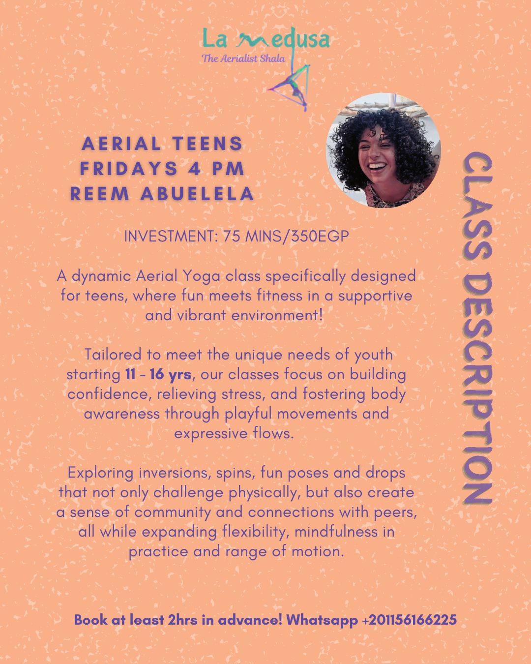 A dynamic Aerial Yoga class specifically designed for teens, where fun meets fitness in a supportive and vibrant environment!